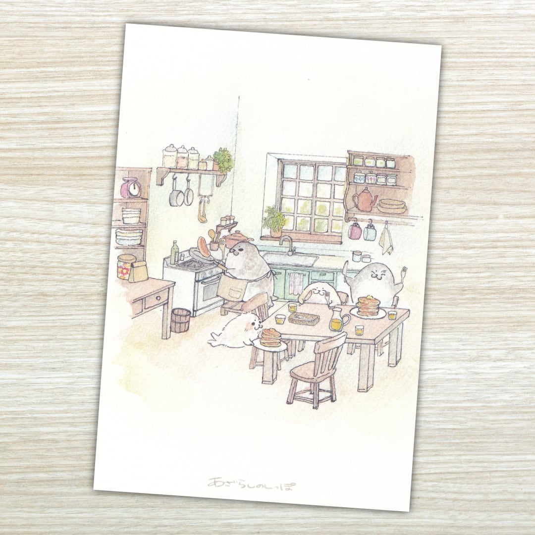 朝のテーブルを囲んで、アザラシたちが嬉しそうにほおばっています。