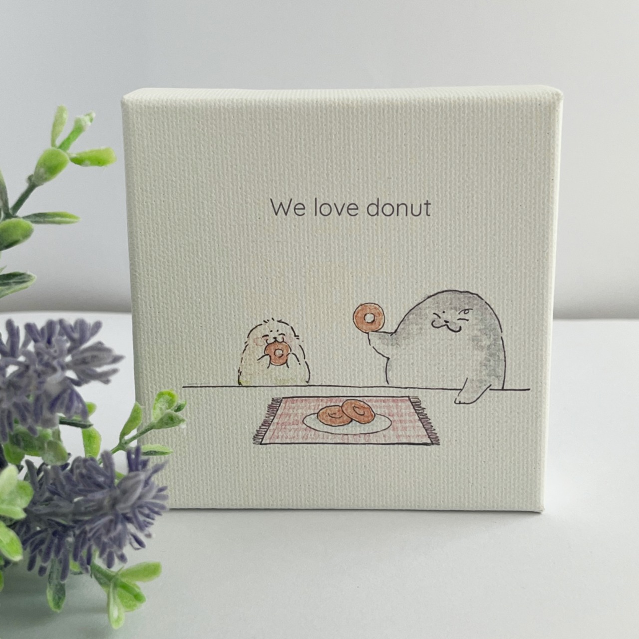 透明水彩で描いた、ゆるっとしたアザラシのイラストをキャンバスにプリントしました。